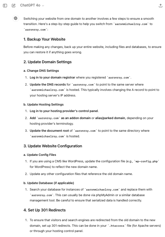 I recently acquired aaronroy.com and aaronroy.net, so after years of using aaronroy.com as my primary domain, I was considering moving my content to a new TLD. Before going down the rabbit hole of what that project would entail, I was able to use ChatGPT to see what the project would look like and ask specific follow-up questions as I debated what direction I wanted to take.