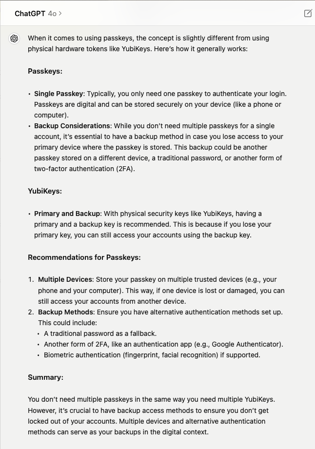 I was looking for a secure option beyond Yubikey’s to manage 2FA on a shared email account. With physical keys like the Yubikey for 2FA, best practice is to have a primary and a backup key set up for a single account so you don’t accidentally lock yourself out if you lose the physical key. I was unsure if you had to follow the same approach with a secure passkey. My prompt:
