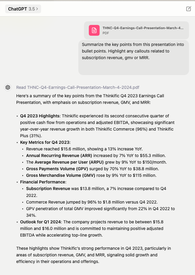 Below, I uploaded the earning’s presentation from one of Teachable’s competitors and was able to have ChatGPT give me a first pass at pulling out some of the key numbers and trends from their public filings.