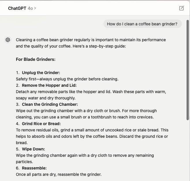 I’ve also found it useful in other ways around the kitchen, using it here to figure out how to clean a coffee grinder.