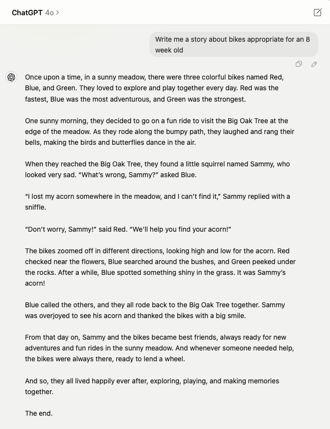I ran out of books within arms reach and needed a story on the fly to read before bedtime. Voila, ChatGPT to the rescue.
